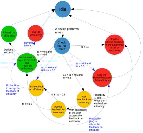A third element is trust. Usually it is applied to solve the problem of identifying trustworthy devices in a network, separating them from the malicious ones []. By the way, the authors of [] provide a review of the use of trust in IoT systems. The same authors identify that trust “helps people overcome perceptions of uncertainty and risk and engages in user acceptance”. In fact, when we have autonomous tools able to take various different decisions and these decisions involve our own goals and results, we have to be worried not just about their correct functioning (for each of these decisions) but also about their autonomous behavior and the role it plays for our purposes.