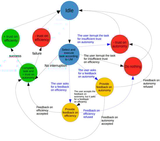 The last factor is the feedback acceptance probability for the autonomy, a characteristic of the specific user. From the results (Table 3), it seems that this factor has no relevance, but it is not what it looks like. As we have shown, the feedback acceptance probability for the autonomy influences the speed at which the corresponding final trust values are reached, so that a “more willing to innovate” user will reach those values first.