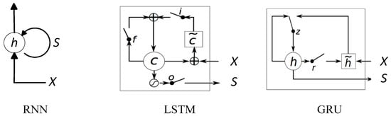 where r and z is the reset gate and the update gate, respectively. The structures of the RNN, LSTM and GRU are shown in Figure 1. The gate functions, such as , and in an LSTM, restrain the exploding of memory gradient and reformulate the gradient from a continuous multiplication expression to a sum expression. That is why LSTMs and GRUs can solve the problem issues, especially the vanishing gradient.