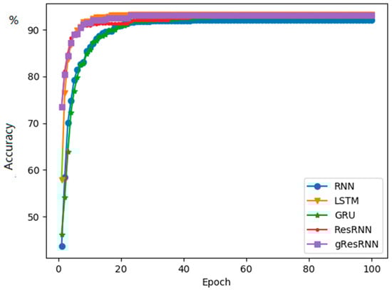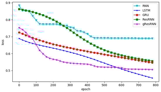 The losses of different networks are shown in Figure 4. In this experiment, the GRU and LSTM converge faster than Res-RNNs, but the Res-RNNs take less time in each epoch. The gated Res-RNN performs better than GRU, but not as well as LSTM. This experiment shows that our Res-RNNs can provide a competitive accuracy with the GRU and LSTM with less training and testing time.