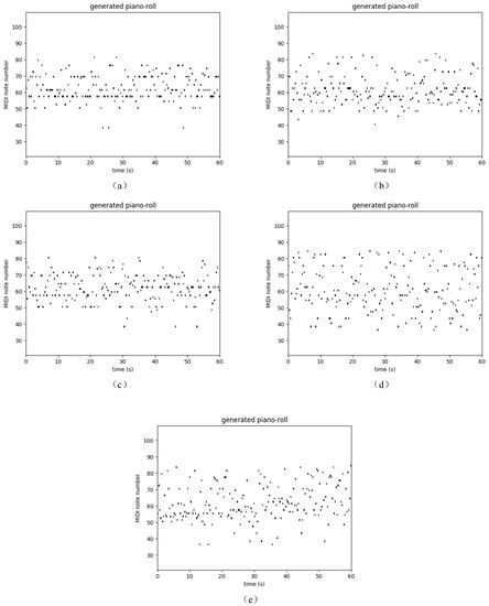 Sample of polyphonic music generation by the (a) RNN [9], (b) LSTM [16] and (c) GRU [17], (d) Res-RNN and (e) Res-RNN with gates trained with the databases of JSB Chorales.
