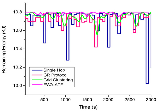 Figure 2 depicted the total residual energy of the proposed scheme as well as existing schemes with the comparison. The remaining energy is the most crucial parameter to estimate the performance of the wireless rechargeable sensor network. The remaining energy is computed after the completion of one energy cycle of the system. The evaluation shows that the total remaining energy of the system with the help of firework algorithm with the adaptive transfer function (FWA-ATF) significantly improved as compared to existing techniques.