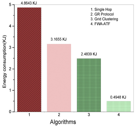 Energy consumption refers to the total energy conserved by the network reception, transmission, and data processing. In the proposed model, a comparison is performed among the different techniques such as single hop, GR protocol [10], grid clustering [11], and firework algorithm with the adaptive transfer function (FWA-ATF) based on energy consumption. Energy consumption helps to predict the lifetime of the network. Figure 3 shows the comparison of power consumption of proposed and existing algorithms regarding energy consumption. It is evident that swarm intelligence based clustering algorithm achieves the best results compared with existing algorithms.