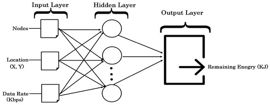 In this study, swarm intelligence method has been implemented to improve the network lifetime. Further, the obtained experimental results of the swarm intelligence were validated by the machine learning approach artificial neural network (ANN). The three-layer architecture of the ANN model depicted in Figure 5 was employed for this study. The first layer consists of three neurons-like nodes. For the location of the nodes, data transfer rate, and output layer, only a single neuron was employed, i.e., the remaining energy of nodes was selected. The neural network complexity was evaluated by the presence of hidden nodes in the layer. Although, the presence of several neurons may lead to over fitting for the model [26]. After several trials and training, the best model was generated. The greatest number of epochs was found by trial and error method. The performance goal and minimum performance gradient were usually for the affirmation of the good performance. The total dataset was separated into three subsets—50% data for training, a further 25% for validation, and the remaining 25% of the data was employed as an investigation set. The dataset was normalized (0,1) [27] by applying the equation