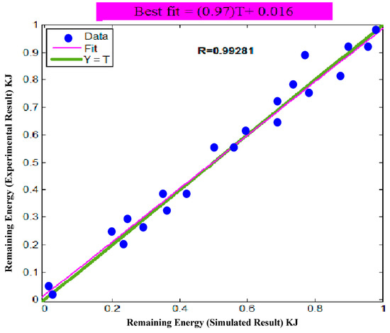 The evaluation affirms that 10 neurons generate at fewest errors in the training and endorsement sets. The remaining energy in the nodes was selected as an output and the best coefficient correlation (R) among the model prediction and obtained experimental results showed close to 1 recognized to be an ideal model for this present study. The maximum ANN architecture is based on feed forward networks and it has been trained via a backpropagation algorithm. The linear transfer function “PURELIN” was selected for the input to the hidden layer further “Tansig” functions were selected for the hidden layer to the output layer. The obtained data of correlation coefficient (R) calculated the best match among 20 consecutive runs. The regression plot is shown in Figure 6. After completion of the ANN training, the network provides the correlation coefficient value of 0.992. In the present study, conjugate gradient backpropagation with Polak–Ribiere (Traingcp), resilient back propagation (Trainrp), gradient descent with momentum, adaptive learning rate backpropagation (Traingdx), scaled conjugate gradient (Trainscg), and Levenberg–Marquardt backpropagation (Trainlm) were evaluated for the best output result. It suggests that Resilient Backpropagation fits well with the obtained data as demonstrated in Table 3. After training the ANN, the resilient backpropagation (Trainrp) fit well compared to other algorithms applied in this present study.