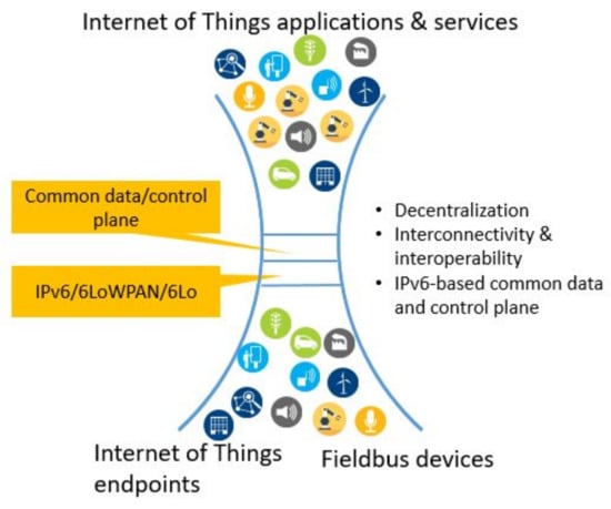 Convergence towards a common IPv6-based data and control plane connecting Internet of Things (IoT) endpoints and fieldbus devices with decentralised applications and services.