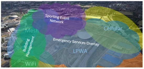 Interconnecting heterogeneous networks and providing a service layer to support new applications and services is a critical ingredient in the evolving technology mix required to achieve these objectives. In Figure 2, we depict an example of multiple services operating in an overlay fashion on a heterogeneous network comprising a combination of WiFi, LPWA, cellular mobile and wireless mesh technologies. A converged IP layer on a heterogeneous network infrastructure is a necessary requirement to support the proliferation of future cyber–physical systems (CPS) targeted for new industrial/manufacturing and vehicular network use cases.