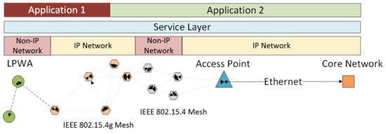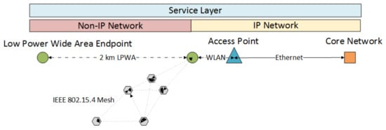 We focus on the convergence of wireless technologies associated with the IoT and conventional enterprise networks. We propose a common data/control plane operating on an IP-interconnected hetnet comprising low power wide area (LPWA), IEEE 802.15.4 mesh, Ethernet, and wireless local area network (WLAN) technologies. Wireless technologies commonly associated with the IoT include IEEE 802.15.4 mesh [], LoRaWAN [], Sigfox [], NB-IoT [], Weightless-P [], random-phase multiple access (RPMA) by Ingenu [], and MIoTy from Fraunhofer-IIS [], amongst others. In a previous work, we provided additional detail regarding the real-world performance of a selection of these wireless IoT networking technologies []. An example depicting LPWA and mesh is shown in Figure 3, where two non-IP technologies, LPWA and IEEE 802.15.4 mesh, are used as part of a WLAN- and Ethernet-based heterogeneous network. Our research focused on how we could enable these different systems to form a single connected layer abstracted from the underlying hetnet infrastructure, and upon which, support more services.