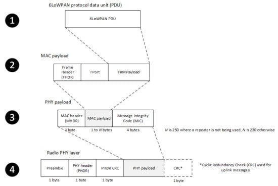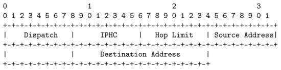 6LoWPAN also presents a number of challenges. Specifically, IP support over IEEE 802.15.4 networks is not trivial; the worst-case 802.15.4 protocol data unit (PDU) size is 81 octets, whereas IPv6 maximum transmission unit (MTU) requires 1280 octets []. Stacking IP and above layers “as is” may not fit within one 802.15.4 frame; for example, IPv6 40 octets, TCP 20 octets, UDP 8 octets and other layers (security, routing, etc.) can result in a large overhead.