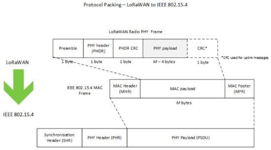 We use the term protocol packing to denote the process of packing one protocol frame inside the payload field of another protocol frame. By adopting this approach, both protocols remain standards-compliant. An example is depicted in Figure 7, where a LoRaWAN frame is packed into the payload field of an IEEE 802.15.4 MAC frame. In this example, the entire LoRaWAN radio PHY frame comprising the preamble, PHY header, cyclic redundancy check (CRC), PHY payload, and frame CRC (for uplink messages only), is simply encapsulated into the MAC payload of an IEEE 802.15.4 frame. Following the pre-pending of the IEEE 802.15.4 MAC header and appending the MAC footer, the hybrid payload is then used as the PHY payload for the complete IEEE 802.15.4 frame.