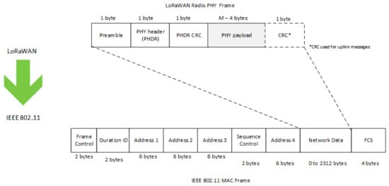 A similar approach can be adopted for packing LoRaWAN frames inside IEEE 802.11 frames. We outline this process in Figure 8. In this example, the complete LoRaWAN frame is encapsulated within the network data field of the IEEE 802.11 MAC frame.