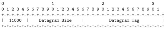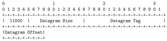 We extended the baseline fragmentation strategy set out in Internet Engineering Task Force (IETF) 6LoWPAN. In the baseline strategy, if a datagram does not fit within the size of a single IEEE 802.15.4 frame, it is broken into link fragments. The fragment offset can only express multiples of eight bytes, and therefore, all link fragments for a datagram except the last one must be multiples of eight bytes in length. The first link fragment contains the first fragment header defined, as shown in Figure 9.