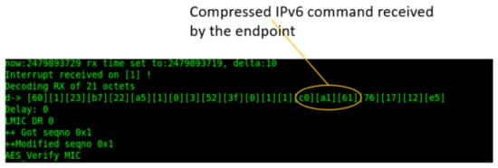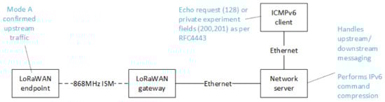 For the purposes of our research and as a representative candidate of a technically challenging technology that does not natively support IP networking, we focus on LoRaWAN. LoRaWAN is a popular low-power wide-area wireless networking technology using a protocol defined by the LoRa Alliance and formalised in the LoRaWAN specification [,]. It uses a chirp-spread or frequency shift keying (FSK) modulation scheme and is primarily targeted to the industrial, scientific and medical (ISM) radio bands. It is designed to support medium-to-long-range communications between energy-constrained wireless nodes and gateways, which operate in conjunction with backend network and application servers. LoRaWAN has three modes of operation; Modes A, B and C. In Mode A, endpoint devices initiate upstream messages and may open receive windows one and two seconds following transmission for receipt of downstream acknowledgements and/or additional MAC instructions, for example, for adaptive data-rate control. In Mode B, endpoints may receive beacons from gateways in addition to the Mode A functionality. In Mode C operation, endpoint devices may continuously receive frames when not transmitting messages.