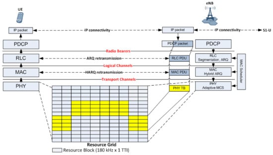 4G LTE Radio Access Network: RAN comprises large number of eNBs establishing radio connections to user devices (UEs). Figure 3 illustrates RAN user plane protocol stack for data delivery between eNB and UE. IP data flow towards UE passes through the Packet Data Conversion Protocol (PDCP) for header compression and ciphering, and Radio Link Control (RLC) protocol for segmentation/concatenation into suitably sized RLC packets that match the MAC frame size. If used in acknowledged automatic repeat request (ARQ) mode, RLC handles error-free and in-sequence RLC packet delivery between the eNB and UE. MAC layer introduces hybrid ARQ (HARQ) protection where, if MAC frame is not received correctly, up to three additional incremental redundancy MAC frames are transmitted. Finally, each MAC frame is allocated a single PHY transport block (PHY TB) placed into an OFDM-based time-frequency resource grid available to the eNB [43].