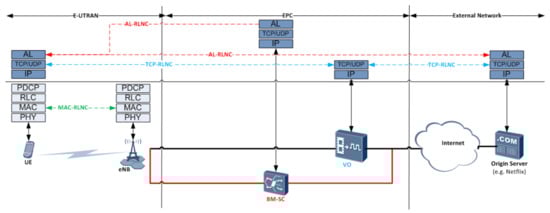 Application Layer RLNC: The simplest and easiest approach to integrate RLNC sublayer into mobile video delivery is to perform application-layer RLNC (AL-RLNC). In particular, for multicast/broadcast scenario (eMBMS), the required infrastructure is already in place, as eMBMS provides native support for AL-FEC [9]. However, in this case, RLNC provides similar performance as compared to already proposed AL-FEC solutions such as Raptor codes [57] or LDPC triangle/staircase codes [58], providing limited benefit since no re-encoding at intermediate nodes is typically assumed in multicast/broadcast setup. Nevertheless, a large number of academic studies considered application and optimization of RLNC for mobile multicast video delivery demonstrating various benefits in different scenarios [59,60,61,62]. Besides notable benefits of AL-RLNC in terms of flexibility and ease of implementation, there are several drawbacks of AL-RLNC worth emphasizing. AL-RLNC introduces redundancy either at the content server or BM-SC (eMBMS) thus adding significant communication overhead across the entire end-to-end IP multicast session, including typically reliable and over-provisioned core network optical links. In addition, AL-RLNC is transparent to lower layers and, in practice, it is hard to provide cross-layer optimized solution, e.g., at unreliable eNB/UE interface, that takes into account AL-RLNC. For unicast video streaming services, AL-RLNC is usually not considered as the most popular ABR/PD streaming solutions rely on HTTP via TCP, which already provides reliable packet delivery. However, this might change as more and more ABR traffic moves to Quick UDP Internet Connections (QUIC) protocol which relies on UDP [63]. However, note that most of the current unicast video traffic is encrypted, which might introduce practical limitations in applying RLNC at all layers below the application layer.