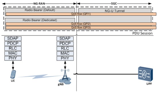 5G NR Radio Protocol Architecture - User Plane:Figure 7 (left) illustrates the protocol stack for the gNB user plane that includes Service Data Adaptation Protocol (SDAP), PDCP, RLC, MAC and PHY sublayers. The new SDAP sublayer is introduced to 5G NR targeting specifically Quality of Service (QoS) control in NG-RAN. SDAP handles: i) the mapping of 5G QoS flows to data radio bearers (DRBs), and ii) marking of 5G QoS flow Identifier (QFI) to a QoS flow in both DL and UL packets. We will discuss in more detail 5G QoS architecture later in this subsection.