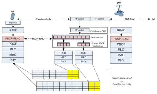 One of the key elements of 5G QoS architecture is a novel SDAP protocol defined at NG-RAN user plane interface. SDAP is additional resource allocation entity in 5G NR that will complement MAC scheduler. While the “lower layer” MAC scheduler aims to dynamically schedule resource blocks to different UEs in order to maintain guaranteed or best possible DRB parameters, the “upper layer” SDAP scheduler aims to assign QoS flows to different DRBs in order to satisfy their QFI-defined parameters. Note that different DRBs defined at the interface towards the UE may be configured using different NG-RAN protocol configurations. In this sense, coded PDCP duplication described above may provide a flexible approach to trade off reliability and latency and fine tune QFI-defined requirements in terms of packet loss rates and packet delay for a given DRB.