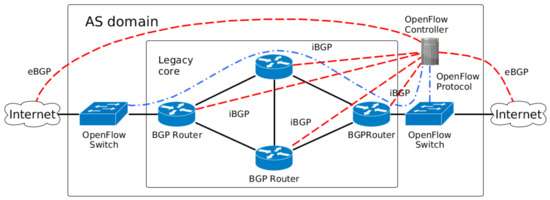 - Legacy network: With the legacy network in the core, the SDN controller is the centralization logic that acts as Route Server for the BGP routers. Figure 1 depicts a scheme for mixing OpenFlow switches and legacy network appliances. The legacy core is connected through internal BGP (iBGP) sessions to the OpenFlow Controller, which distributes external routes to the internal BGP routers. The infrastructure routes continue to be distributed with the interior gateway protocols (such as OSPF) executed in the Legacy core perimeter.
