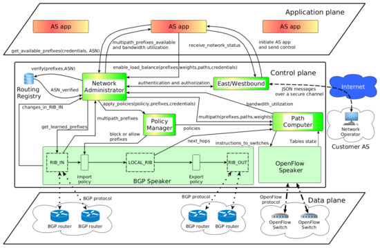 - Feamster, N.; Rexford, J.; Shenker, S.; Clark, R.; Hutchins, R.; Levin, D.; Bailey, J. SDX: A Software-Defined Internet Exchange, Open Networking Summit. 2013, pp. 2–3. Available online: http://www.cs.princeton.edu/ jrex/papers/sdx-ons13.pdf (accessed on 10 April 2018).