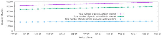 The period from December 2015 to October 2017 was considered. Figure 4 presents the total number of public ASN in CAIDA’s AS relationship database as well as the total number of stub ASes with public ASN and a subset of this total representing the total number of multi-homed stub ASes with two relationships of customer-to-provider. Thus, as the multi-homed customer ASes with two ISPs are typical in recent months of the Internet, and, considering the hardware resources of this research, the evaluation testbed of the proposed architecture adopted a topology with two outbound links, one for each ISP, and a multi-homed customer AS.