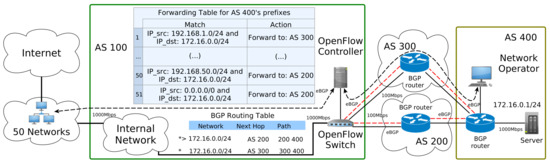 - Gupta, A.; MacDavid, R.; Birkner, R.; Canini, M.; Feamster, N.; Rexford, J.; Vanbever, L. An Industrial-Scale Software Defined Internet Exchange Point. In Proceedings of the 13th USENIX Symposium on Networked Systems Design and Implementation (NSDI 16), Santa Clara, CA, USA, 16–18 March 2016; pp. 1–14. [Google Scholar]