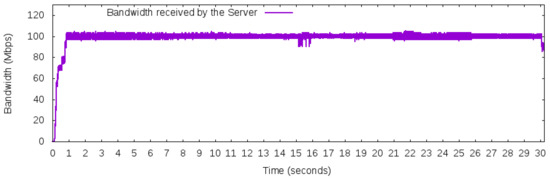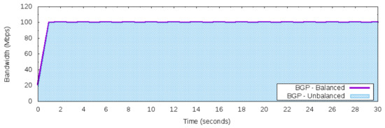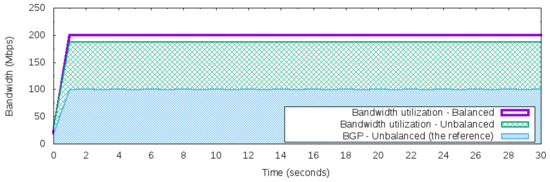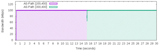 - Maximum constant network traffic for BGP behavior: This workload produces 100 Mbps of bandwidth usage during the 50 Networks 30 s of use iperf in client mode to generate the UDP packets. The workload was designed to explore the BGP behavior of using just one “best” next hop (per prefix). Thus, based on the adopted topology in Figure 5, this workload will only use one path to carry this traffic, either path [200,400] or path [300,400], but not both to reach prefix 172.16.0.0/24 of AS 400.