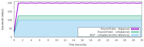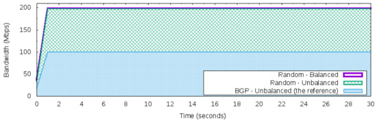 - Constant network traffic with balanced rate: Different from the Maximum constant network traffic for BGP behavior, this workload produces 200 Mbps of bandwidth from the 50 Networks. The total volume of traffic is split equally into each network. Hence, each one will be responsible for producing 4 Mbps of network traffic using UDP packets during the 30 s.