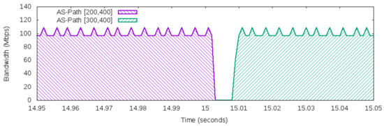 The workload produced 100 Mbps of network traffic and used the path [200,400] as the “best” next hop and path [300,400] as a backup path. In the 15th second, the link connecting AS 100 and AS 200 failed. After the link failure in the 15th second, the FF mechanisms took a few milliseconds to discover the disruption. Once this occurred, the traffic automatically shifted from path [200,400] to path [300,400]. This process was done exclusively in the data plane (OpenFlow switches) and took less than ten milliseconds, which is an acceptable value for disruption in an inter-domain environment (less than 50 ms [34]). The measured millisecond interval was coherent with the FF mechanism recovery times found in the literature [35,36].