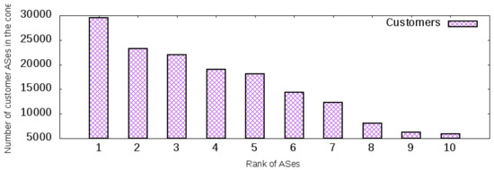Thus, the first ten ASes in this ranking were selected and the number of ASes in their Customer Cone were measured. Figure 13 depicts the potential of the proposed architecture in the Internet. The first 10 ASes in the ranking had an expressive quantity of direct or indirect customer relationships that could allow those customers to use the benefits of the deployment of the proposed architecture. Therefore, if one of those 10 ASes provided network services to control the inbound management of network traffic to its customer in the cone, those customer ASes could explore the path diversity of the Internet by using an AS app, as shown in the previous section.