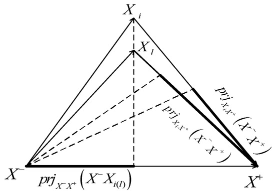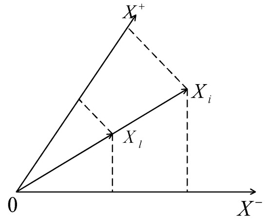 The bigger the value of , the closer the alternative to positive ideal alternative . Analogously, the bigger the value of , the closer the alternative will be to negative ideal alternative (as shown in Figure 1 [29]).