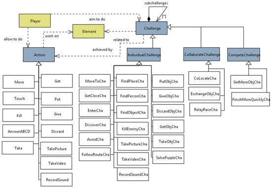 Two kinds of concepts are included in this perspective. Challenge concepts depict goals that players need to fulfill and Action concepts describe behavior that players are allowed to perform to overcome such challenges. In some games, many challenges can be achieved by one action. For instance, Challenges like MoveToCha (moving to a place), GetCloseCha (getting close to a place or an area), EnterCha (entering an area), and AvoidCha (avoiding getting close to a place or an area) can be achieved by one action Move. On the other hand, it is also possible that one challenge can be fulfilled by performing different actions. For instance, GetObjCha can be achieved by Move (by co-locating only) or by Move and Get (by co-locating and an explicit action to get). Challenges and Actions must be designed carefully in order to achieve unique and interesting game experiences.