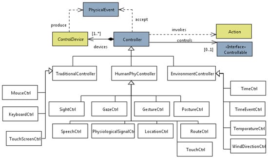 When HumanPhyController is involved, physical sensors including cameras, microphones, or gyroscopes are utilized to measure the player’s physical information to change game status or invoke actions. Such information may be about physical location or physiological signals (for example, heart rate, brainwaves) of human beings. HumanPhyController also transforms data to meaningful or more structured formats from its original format, generated in control devices. For example, when location information is sensed in a GPS device, RouteCtrl (which is connected to the GPS device) not only records location continually but also calculates routes according to and reacts according to the routes. On the other hand, in pervasive games, sensors are also used to capture information in the physical environment (such as temperature and wind direction) to control the game status. EnvironmentControllers are used at that time. An overview of Controllers is shown in Figure 6.