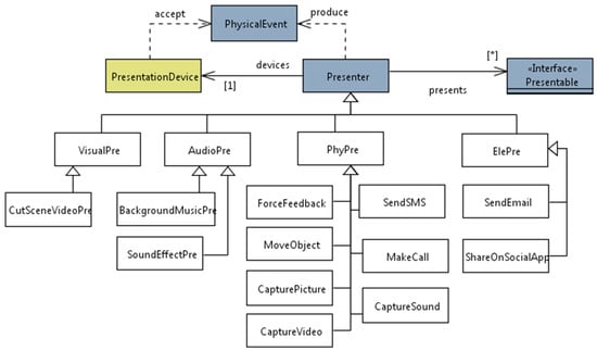 In Figure 7, concepts in the Presentation perspective are presented. In pervasive games, in addition to general video (VisualPre) and audio (AudioPre) presentation, the physical (PhyPre) and electronic (ElePre) approaches are also used to present game status. Typical physical approaches include producing force feedback (ForceFeedback), moving physical objects (MoveObject) and typical electronic approaches such as capturing a picture (CapturePicture)/video(CaptureVideo)/sound(CaptureSound), making a call (MakeCall), sending a short message (SendSMS), sending an email (SendEmail), or pushing data to update the social network status (ShareOnSocialApp).