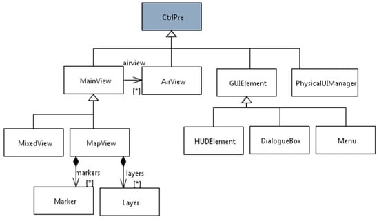In this perspective (as shown in Figure 8), concepts regarding logic for control and presentation at the same time are included. Generally used concepts include GUIElement (Graphical User Interface elements), MapView (the main view showing the overall map), and AirView (smaller view overlapping on the main view and presenting a simplified bird’s eye view). In addition, PhysicalUIManager (to interact with physical UI devices) and MixedView (mixing the real sight of the player and virtual elements) are often used in pervasive games.