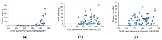 (a) Simulated cyclists travel at high speeds relative to their maximal capacities. The peloton self-organizes so that strongest simulated cyclists tend to spend the most time in highest cost front positions (R = 0.7547); (b) Simulated cyclists travel at medium speeds relative to their maximal capacities. Here there is no discernable preference for cyclists of any strength to dominate the front position. While they do not all share the highest cost position equally, sharing is more randomly distributed (R = 0.2825); (c) Simulated cyclists travel at low speeds relative to their maximal capacities. Like cyclists traveling at mid-speeds, there is no discernable preference for cyclists of any strength to dominate the front position (R = 0.2546). Image adapted from [44] (Figures 4–6).