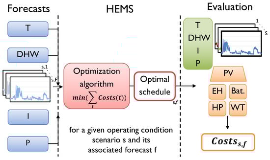 In accordance with literature, the implemented HEMS approaches minimize the device operation costs according to feed-in or demand response (DR) tariffs. HEMS objective function may be formulated differently depending on whether it leverages forecast uncertainty information i.e., stochastic optimization [
