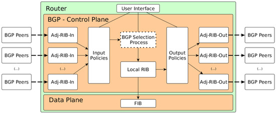 The BGP Control Plane is the place where decisions about how to handle the network traffic are made and where the traffic is sent. Figure 1 presents an abstraction of a BGP router in which the BGP control plane is modeled.