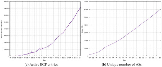 The Internet scalability issue caused by the application of traffic engineering of stub ASs. (a) The exponential growth of routing table size captured by active BGP entries at FIB since 1989. Furthermore; (b) is the unique number of ASs on the Internet from 1997 until 2018. The data were extracted from http://www.cidr-report.org/as2.0/.