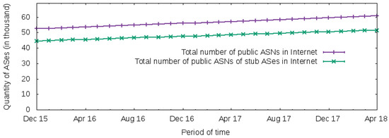 - Potaroo.net. Advertised AS Count. 2016. Available online: http://bgp.potaroo.net/as2.0/bgp-average-aspath-length.txt (accessed on 16 May 2018).