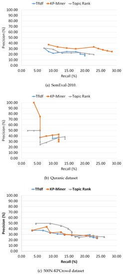 - KP-Miner The KP-Miner precision-recall curves (Figure 2) show a similar progression to that of TF-IDF, precision falls when recall raises. The overall performance of KP-Miner on SemEval-2010 dataset is better than both TF-IDF and TopicRank. For all the variations of top K key concepts, the highest scores are achieved by KP-Miner (Figure 2a). We may attribute this to the fact that KP-Miner weighs more to multiword concepts as can be seen in Figure 3a. KP-Miner is based on tf-idf model and as discussed earlier that idf, which measure the rareness of a phrase, is affective only if there are more documents in the corpus and document frequency of a word or phrase is low. Therefore, because multiword phrases are less frequent and rare across the document corpus, therefore, on SemEval-2010 dataset, where the number of documents in the corpus is higher than Quranic dataset, the multiword concepts may get some effective score. By investigating the other factors that contribute to higher number of multiword keyphrases extracted by KP-Miner, it is found that the author of KP-Miner assumes that compound keyphrases do not occur more frequently compared to single words with in a document set. Based on this assumption the document frequency for multiword key concepts is set to 1, which will result in maximum IDF value, thus giving maximum score to multiword key concepts. We speculate that here KP-Miner is biased towards multiword key concepts. The performance of KP-Miner on Quranic and 500N-KPCrowd dataset supports our argument because in that case the idf values of both methods are close to each other, for both single and multiword concepts that result in somewhat overlapping patterns with TF-IDF (Figure 2b,c).