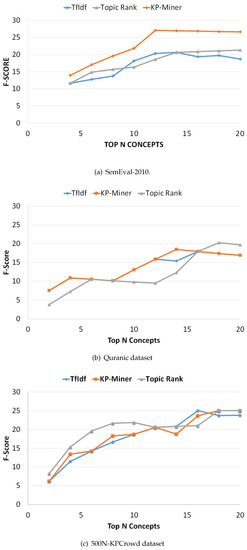 We now evaluate the overall performance of the selected methods in terms of F-Measure on the selected datasets. Figure 4 indicates the F-measure curves for the methods on each of the three datasets, connecting the F-measure scores at various positions. A common observation on both datasets is that as the number of top N concepts increases the F-measure score also increases, reaching a maximum value. On SemEval-2010 dataset the KP-Miner score becomes larger with the increase in ranking position, as compared to TF-IDF and TopicRank (Figure 4a). However, on Quranic and 500N-KPCrowd datasets KP-Miner shows overlapping pattern to that of TF-IDF (Figure 4b,c), and the reason is the same as discussed earlier that KP-Miner is also based on tf-idf model. Therefore, when the idf score for both methods is close to each other, then slight difference remains between them.