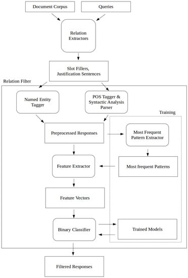 All of these enhancement methods are incorporated within the pipeline of an individual system and aim, in most cases, at a particular system or work best for particular relations. In contrast, this paper describes a generic approach that can be easily integrated to any relation extractor and which can be trained on any relation, regardless of the domain. An alternative to single system enhancement is ensemble learning. In an incentive to encourage the development of ensemble learning techniques, TAC also proposes the Slot Filler Validation (SFV) task, which consists in refining the output of ESF systems []. Ref. [] has developed a system participating in the TAC 2013 SFV task that uses an aggregation approach. For a given query, it aggregates “raw” confidence scores produced by individual slot fillers to produce an aggregated confidence score. This value is obtained based on the number of occurrences of a response and the confidence score for each occurrence. A variant of their method assigns a weight to each occurrence based on the “general confidence” of the system that submitted the response. Their approach achieves great performances for single-value slots (Precision: 0.797, Recall: 0.794, F1: 0.795) but does not perform as well for list-value slots. Similarly, Ref. [] has developed a system using stacking that trains a classifier to optimally combine the results of multiple systems. Their system combines the output of various systems in the TAC ESF task using a “meta-classifier” and using the systems’ confidence score. The authors also derive features from document provenance and offset overlap, i.e., the proportion of characters that are common between justifications of every response submitted for the slot. For a given query/relation pair (slot), if N systems provide answers and n of those systems provide the same docid as provenance, then the provenance score associated with this docid is equal to n/N. Similarly, they use the Jaccard coefficient to measure the offset reliability of a response relatively to other responses for the same slot. Similarly to Relation Factory [], they use an expansion method based on Wikipedia anchor text applied on the filler, in order to detect redundant responses, thus increasing precision. This method allows them to achieve an F1 of 50.1% on the 2014 SF submissions, which is greater than the best performing system (39.5%).