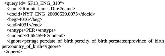 - Ellis, J. TAC KBP 2013 Slot Descriptions; TAC: Geelong, Australia, 2013. [Google Scholar]