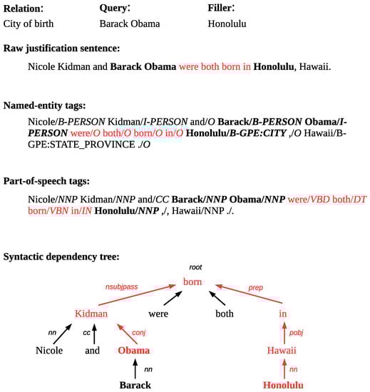 - Angeli, G.; Gupta, S.; Jose, M.; Manning, C.D.; Ré, C.; Tibshirani, J.; Wu, J.Y.; Wu, S.; Zhang, C. Stanford’s 2014 Slot Filling Systems. In Proceedings of the Text Analysis Conference Knowledge Base Population (KBP) 2014, Gaithersburg, MA, USA, 17–18 November 2014. [Google Scholar]