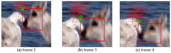 The traditional particle-filter-based tracking algorithms directly put all of the particles in accordance with the Gaussian distribution, according to the state of the particles in the previous frame, and do not take into account the relationship between these particles. When tracking a fast moving target, the tracking accuracy is affected because of the small or even zero number of particles covering the target. To tackle this problem, in our tracking algorithm, all of the particles are divided into two parts. In the first part, the particles are put in the same way as the traditional particle filter, while the other particles are put at the location where the particle that is put in the first part is most similar to the target template. Figure 1 illustrates the details of the particles put in the third frame of the Deer sequence.