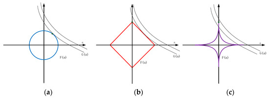 According to the different values of , the classic Lp norm changes as shown in Figure 2. It can be seen from Figure 2 that the intersection of Figure 2a,b is not on the coordinate axis, and the intersection of Figure 2c is on the coordinate axis. Thus, the L1 norm can obtain a sparser solution than the L2 norm, and the Lp norm can get a sparser solution than the L1 norm. In addition, although it is a problem that the Lp norm has a non-convex minimization, it is still possible to obtain excellent solutions efficiently. Thus, compared with the L1 norm, the Lp norm has two advantages, (1) sparser solution; (2) higher flexibility, because is no longer a fixed value.