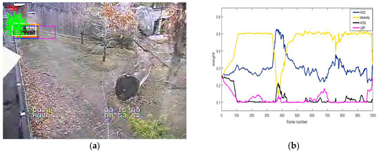In complex scenes, it is difficult to accurately represent the target with a single feature, which may lead to tracking drift or even failure. On the basis of the multi-feature fusion approach that has been proposed in the MTMVT algorithm, we utilized four complementary features (histogram of color (HOC), intensity, HOG, and LBP) to represent the target, and to propose an adaptive multi-feature fusion strategy, as shown in Figure 3a.