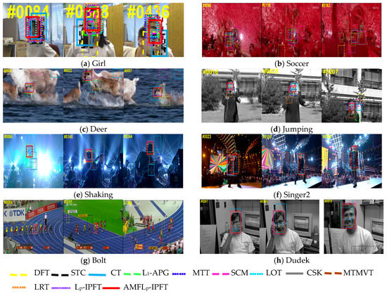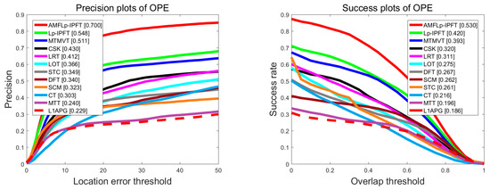 We plotted the precision and success plots, including the area-under-the curve (ACU) score over all of the 50 sequences, as shown in Figure 4. It could be seen from Figure 4 that the proposed AMFLp-IPFT was superior to the other trackers. Table 2 illustrates that our algorithm performed favorably against the competitive trackers. The AMFLp-IPFT performed well against the Lp-IPFT (by 17.9% and 13.9%), MTMVT (by 21.0% and 28.0%), and L1-APG (by 53.7% and 40.4%), in terms of DP and OS, respectively. Compared with L1-APG, Lp-IPFT registered a performance improvement of 35.8% in terms of OS and 26.5% in terms of DP.