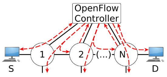 - McKeown, N.; Anderson, T.; Balakrishnan, H.; Parulkar, G.; Peterson, L.; Rexford, J.; Shenker, S.; Turner, J. OpenFlow: Enabling Innovation in Campus Networks. ACM SIGCOMM Comput. Commun. Rev. 2008, 38, 69. [Google Scholar] [CrossRef]