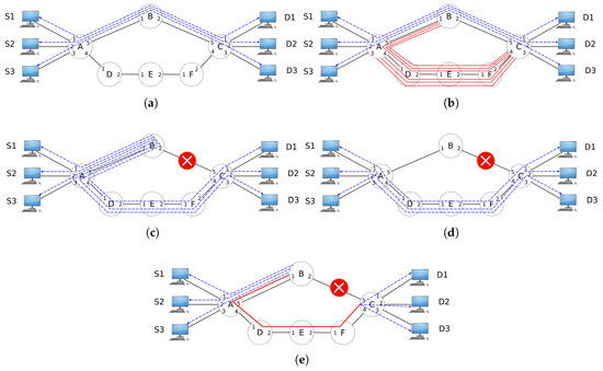 Examples of resilience mechanisms for OpenFlow networks. (a) Flows created from and to nodes; (b) additional rules of Path Protection (PP); (c) after link B-C failure and application of Local Restoration (LR); (d) after link B-C failure and application of Path Restoration (PR); (e) after link B-C failure and application of Local Fast Restoration (LFR).